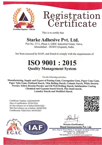 Starke Adhesive Private Limited is involved in the business of Manufacturing, Supplying & Export of starch based Adhesives. We have wide variety of products to customers included Pasting Gum, Corrugation Gum, Paper Cone Gum, Paper Tube Gum, Oxidized Starch, Thin Boiling Starch, Cationic Starch, White Dextrin Powder, Yellow Dextrin Powder, Oil Well Drilling Starch, Starch Binder / Briquette Binder, Pellet Binder, Fish Feed Binder, Textile Printing Gum, Yarn Sizing Gum, Incense / Agarbatti Binder and other products.